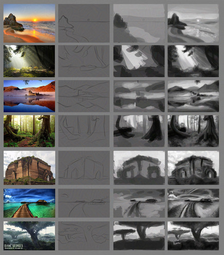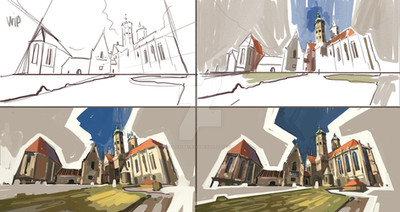 1) Quick B&W composition sketches of basic shapes to establish the general composition and balance of the painting. Thumbnails are developed more, but not too much, to give a little more information. Main idea here is capturing the subject, composition, values and atmosphere (Spanish style town square, nighttime, dynamic lighting, dramatic, etc).