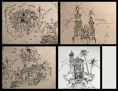2) Various color roughs to play around with potential mood and lighting. I ended up going with the top right choice in the end.