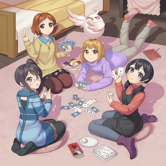 This isn't a formal correction, but tbh I don't see very much wrong with the colors themselves. Maybe you want to exaggerate more? Like the secretive black-haired girl could hide the entire bottom half of her face behind the cards, while the energetic redhead could be standing up a bit more, so her card-slam is even stronger. And, just as a note about the colors themselves, have you tried filling an entire layer on overlay mode and then lowering the opacity to unite the colors a bit more?