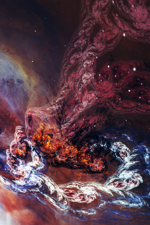 Down on the bottom left we can see Cthulhu shaking his fists angrily at the galaxy for waking him up.