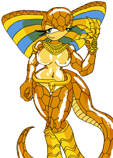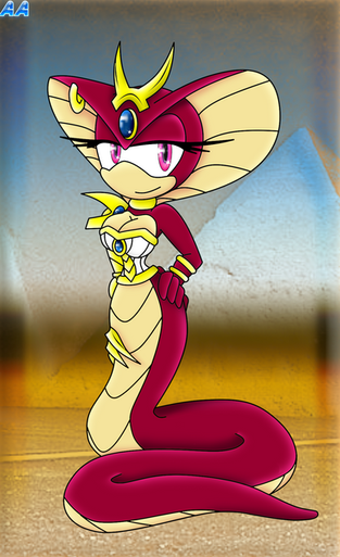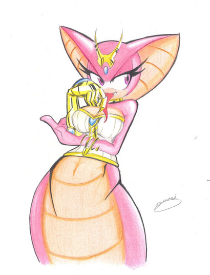 Crimson the Cobra is so sexy, hot and beautiful at the outside but at the inside she is evil and she is always wanting to have Sonic for her lunch as she really swalloes him whole and right into her belly. Plus Crimson has a golden arm on the right side of her shoulder and she mostly licks one of her gold fingers and that does look hot as well. But thats not all even though when she has all seven chaos emeralds and they come together they turn into a purplish magenta colored emerald and she would kiss the emerald and of course she would even use it for her own ring on her left finger and she would be even more lovely and beautiful than everΒ