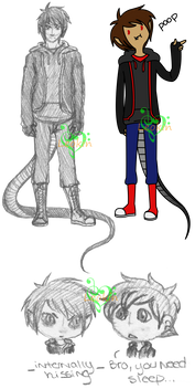 Finally got a good reference going for Blade! He's been with me since around high school. He's gone through some changes and this one was a work through for another world, but I really love him. Think the black tongue and tentacles are going to remain permanent in his appearance from now on cause I love them. This is also kinda based off of his impim form, which is why he's got whiskers and cat like ears, but I'm not upset.For more information on him, he's an assassin that comes from a clan of killers. This clan breeds and raises people to kill for hire and all the currency gathered goes to the head of the clan. They name their people off of the weapons they specialize in. Blade specializes in many different kinds of weapons, but they're all types of blades, so he's named after a generalized type. He escaped when he was younger, but the scars of his "punishments" remain. He's really messed up in the head now, so he switches from assassin mode (seen on the left) back to his more "innocent" side (seen mostly on the right).