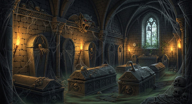 I like this! Nice perspective, although it feels very warm and cosey for a crypt - I'd maybe get some blues and greens in there to give it a colder, scarier atmosphere.