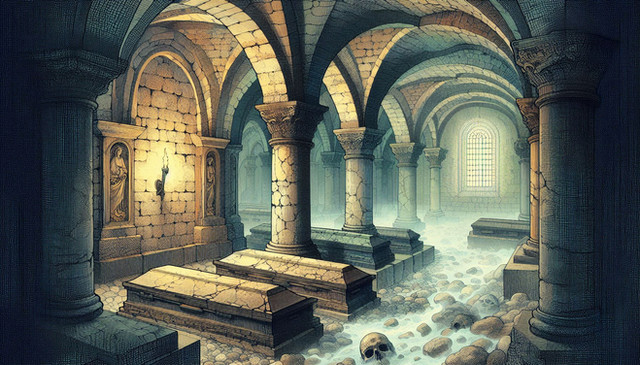 Done as part of a test for a job. Never heard back from them, so I assume its OK to post.Given a floorplan, and asked to design and illustrate a crypt.