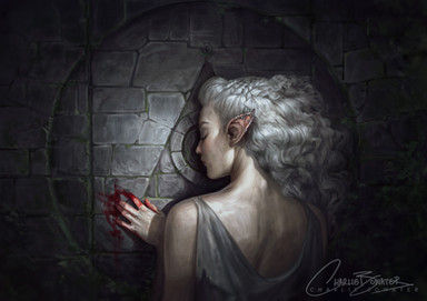 Beautiful! I like how it is monochrome with the exception of the thorns. With her hands on her head and the thorns partially glowing gold, it looks like she is 'charging up' for a spell. Her whole headdress, feathers, hair, thorns...very unique and very striking. Stunning, excellent job.
