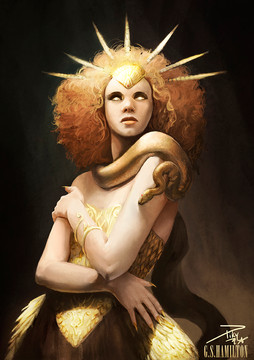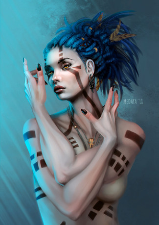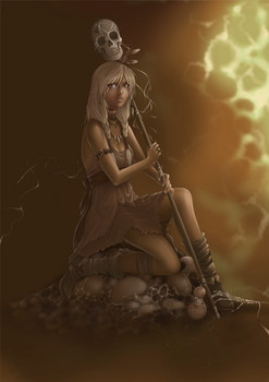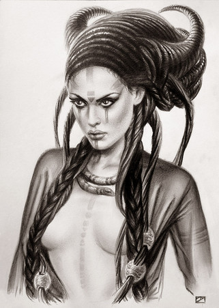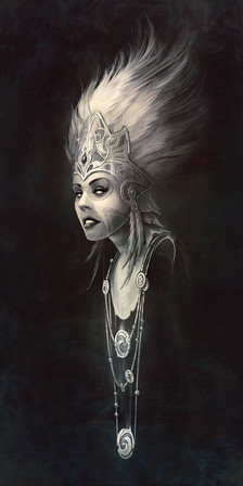 Well the composition is what strikes me the most, there's an bestial quality to the arched back and jutting shoulders. Which quality is so confluent along with the bristling nature of the crown with which she's adorned. The monotone scheme, accented so lightly has a definite effect on this, it creates a simple effect that emphasises the natural bint this has taken. Her expression however throws me. There's some semblance of peace there, but accented by a very serious disposition, of maturity. This I feel is the defining factor, the image rests on this for it's power, the headress, the monotone, the pose all I feel are accentuted by this it turns it from a good piece into a powerful one, and there is great potency to this piece.