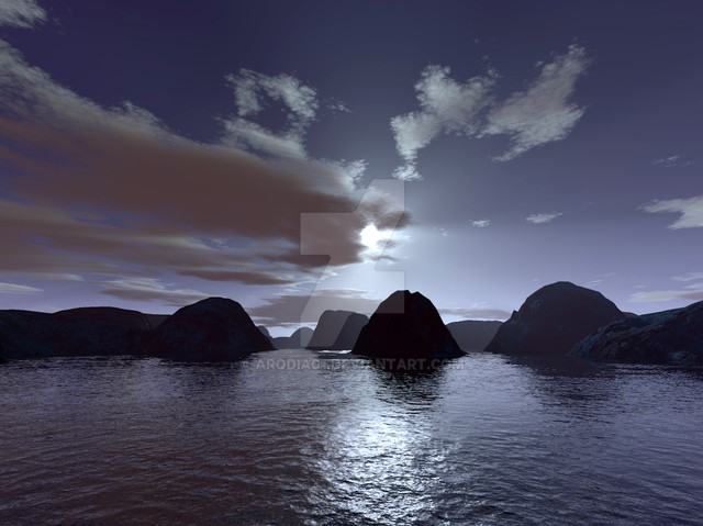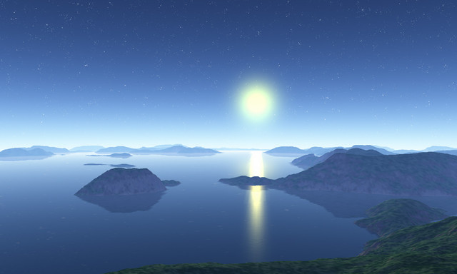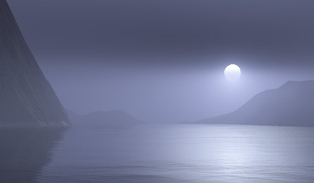 Interesting dynamics you're showing between the illusion of a moonlit night and the sunset and between the desert mountainscape and the lush waterscape. Though together they don't paint an entirely realistic picture, they do still create a very beautiful one. Great job !