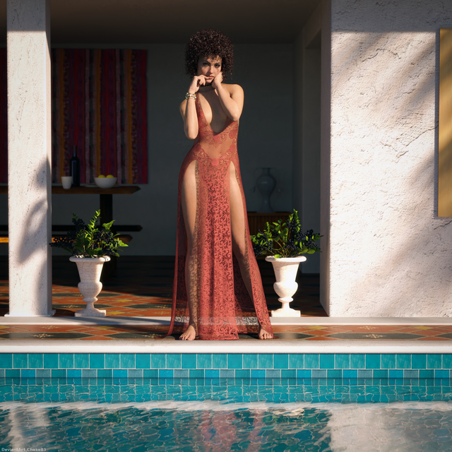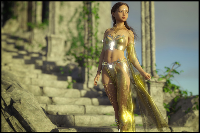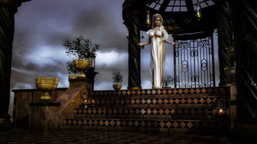 Nice movement of the scarf. Logically the dress should pick up that movement a bit more, but then again, who cares in this beautiful render and scene?