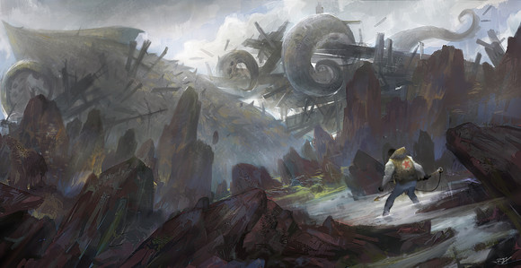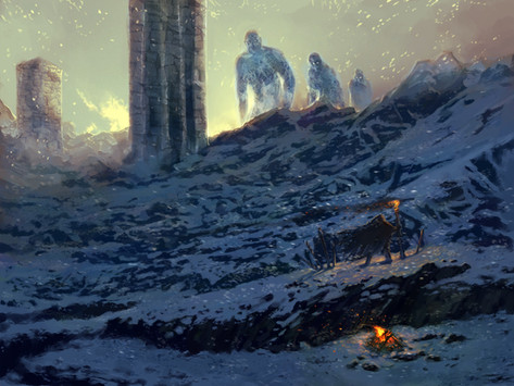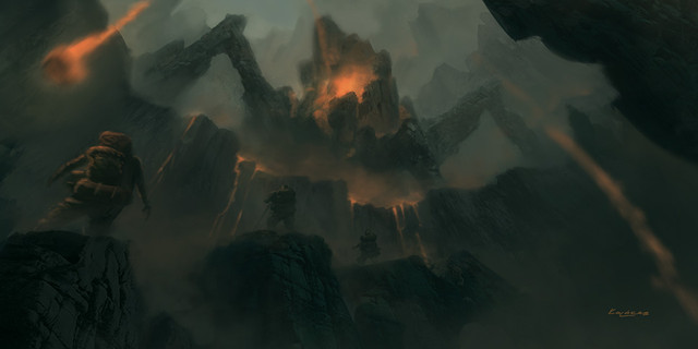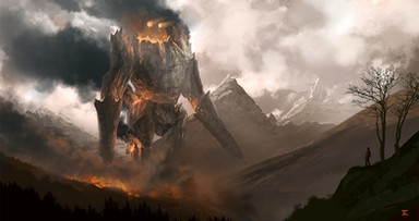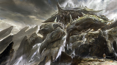 Man, the sense of scale for this creature is just great. It's amazing how you accomplished it by simply having that city in the distance being just down the river from its path. You can already tell that only one of its six legs could crush it. What hope do these two knights have against such a creature?