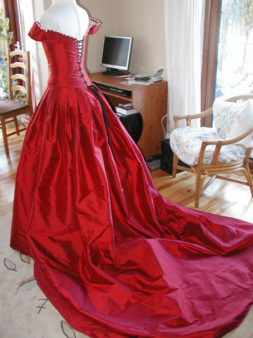 1. Vollers corset: herringbone coutil, middle support layer of thin denim, maroon-red beaded satin cover with side paneling in black silk. Bias tape and hemming-trim of this amazing gold-lace ribbon I picked up last year.