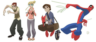 While I don't agree with a few of the designs (mainly Gwen and the third Peter design), I must say, that is one awesome looking Spider-Man, and the designs for Aunt May and MJ look pretty slick as well. The two Peter's... well, not great while not bad. Ok... Keep in mind, I still think the whole piece kicks freaking ass, great artwork.