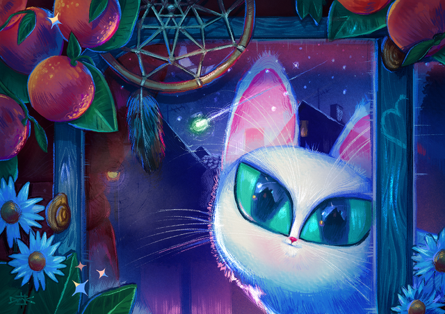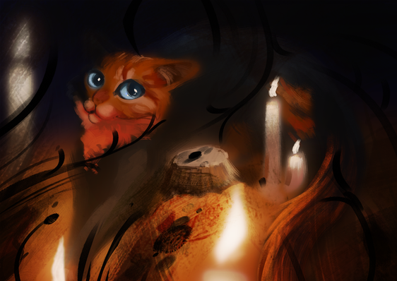 A small cat wanders into the city. He is alone, a scrappy little thing. Something bright catches his eye, a comfy crate of Oranges. Weary on his paws, he curls himself amount them, wondering if the street light will warm his fur. He falls asleep, just as a shadow passes by.He is awakened by a rustling, perhaps nothing but a mouse, but he looks up, and is met with the blank stare of... What is that? Another cat? His eyes are empty and white. The thing vanishes before his wide eyes.