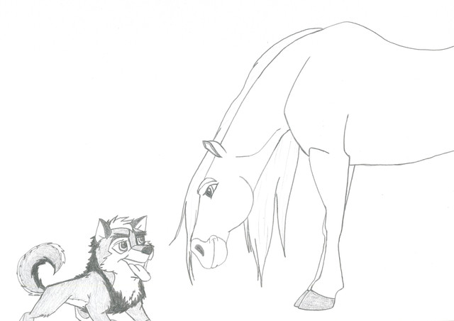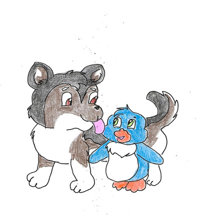 This is Scamper and Cowboy for the Movie Scamper the Penguin. Goodness I love that movie. Here, little Scamper is passed out as Cowboy curiously sniffs him. They are so cute. ^.^Scamper the Penguin (c) Enoki Films