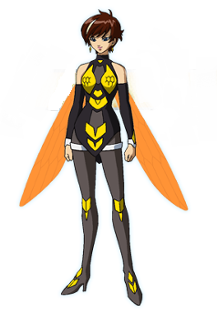 Lacey's Sheerghost has evolved into a butterfly-shaped advent beast. Its name is Venturafly. Her rider suit has changed shape to match her advent beast.