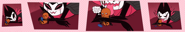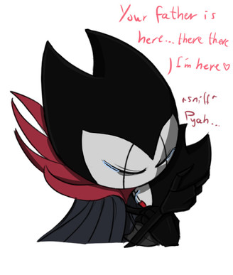 Grimmhilda crying over her tiny, little baby. She’s usually pretty collected and stoic, but her baby just made her melt that cold exterior. The baby’s name is Mmilde!