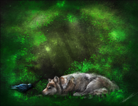 ForΒ PirateQueenLucy ,Β a wolf cub playing with some crows in the forest ^^Painted in Procreate and Realistic Paint Studio on iPad Pro