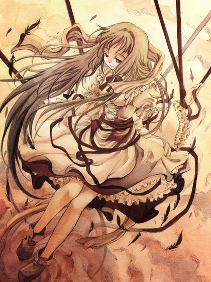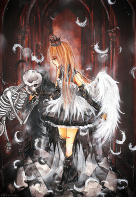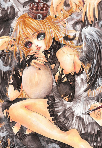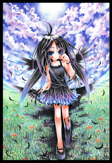 Everytime I looks at Tamari, I'm stunned. She's gorgeous! Her heterechromatic are the prettiest pair I've ever seen and her long, blonde hair, it looks so silky! ;w; I want to steal her outfit by the way! And her scythe possiblyfor Halloweedn next year, too. XD Lmao. I also really like the background in this one and the feathers are beautifully done. Her pose is very neat, too. I need to start drawing harder poses like that myself.