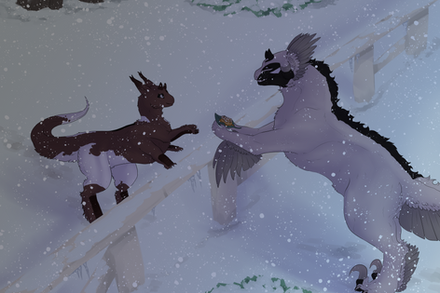 Her eyes flitted between the two, a smile growing as she did. Or rather the smile already present grew wider. "I didn't even see the little guy he blended in with your colour so well. Hey there little dude," she put up a claw to rub under Argo's chin and he squeed happily at the attention.