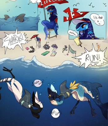 Ahhh, the shading and lighting on this is so pretty! I love the effects of Tenga using water propulsion in the last panel, looks so cool! (Plus I'm a sucker for glowing stuff, haha)