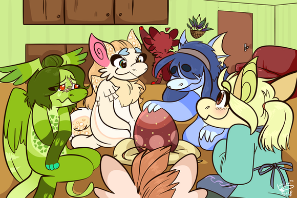 Aaand my other guests arrive at Taki's pouch party ! Finally! Because I'm so slow! AAAAHHAnyway as the title says the 5 of them plus two eggs that Sirius is having trouble balancing because he can't leave them at his camp alone, have arrived to the party!