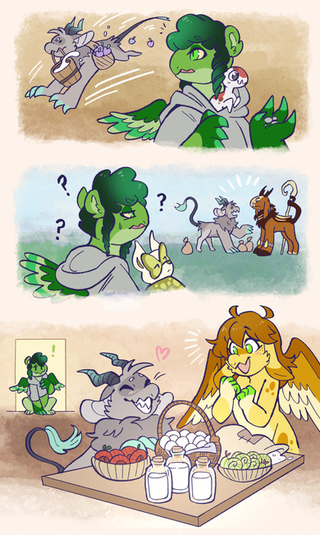The first thing I noticed was that Comet was eggbound, the second was Noah on Wish's shoulders, third Sirius struggling with the eggs, where I was all like "Don't drop them!" the instant I saw it.
