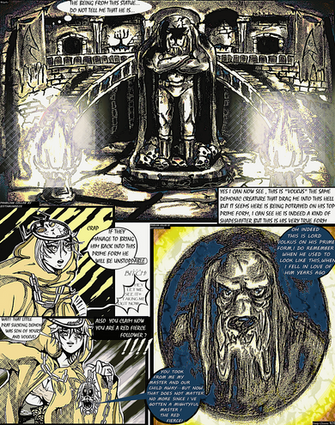 This was done 90% with ink and colored pencil. The sky in the first and second panel is photoshop 3.0, and so is the text. No other changes were made to the page or color except the black paneling.