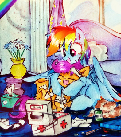Fluttershy stirred slightly. Under the covers, her hoof brushed against Dash's flank, and the cyan pegasus turned bright red. All she could think of were the events of the night before, and the more she did, the more embarrassed she became. Her rainbow mane was a knotted mess, a trademark of the night before. Suddenly, Fluttershy groaned in pain and turned onto her back. The CMC gasped at her bulging stomach, and before Dash could stop them they had wrenched the covers away.