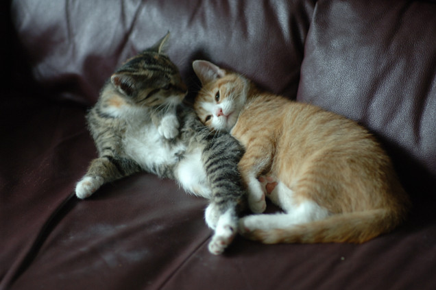 They're both orange+white... their markings are almost the same, so they where a little difficult to tell apart when they where kittens but now they're grown up it's easy to tell them apart, Frank is big and also a little chubby while Elvis is quite small and has a very delicate build... it's so off they're brothers but they've such different body-types.
