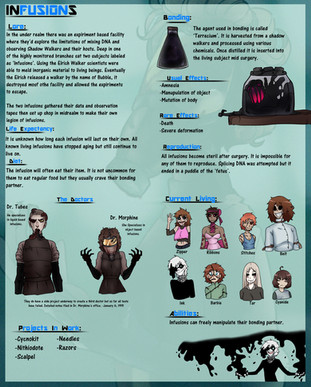 Most of her history is unknown but she was found in a lab in under realm. She was exposed to a forced hybrid surgery resulting in her red tendrils. She spends most of her time wandering between Mid and Under realm fighting her way through creatures and humans alike trying to find answers. She did learn that the walker Rodger is a host for was once in a patient at the facility she was stuck at. So she is working with Zalgo to try and get the walker to approach her and hopefully get some answers.
