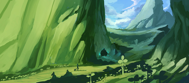 This is beautiful! Looks like it's concept art for a game or a story. I love how the green contrasts with the blue sky.