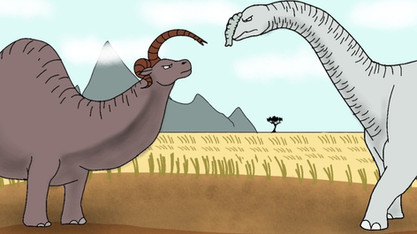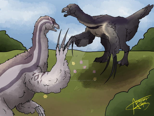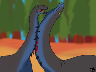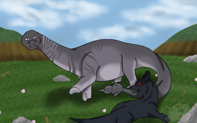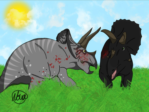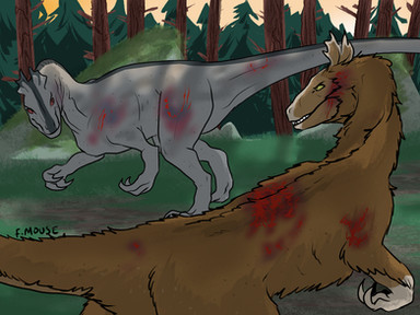 Depict your dinosaur getting into a spat with a dinosaur of higher ranking or physical strength than your dinosaur. It must be clearly shown that your dinosaur is losing, at disadvantage, or struggling to win. This can range from an argument to a full-blown battle. Include at least 50% of the foe dinosaur if you choose to illustrate the scene.