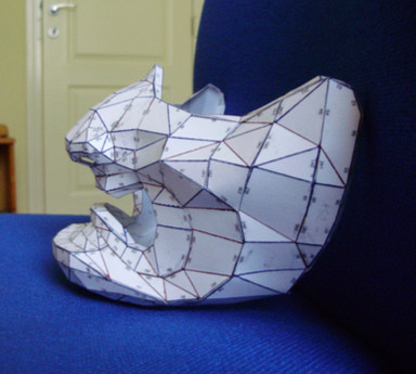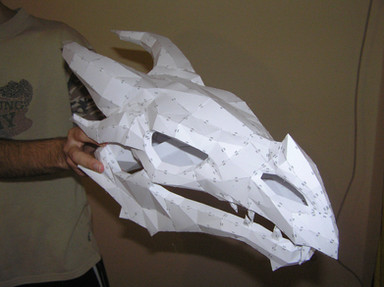 A dragon mask I made with card-stock. I modeled it in 3ds max fit to a head model. I did all the measurements so it fits to my head perfectly. This was an experiment to see how capable I was of transferring a 3d model to the real world. I still need to attach the jaw to it, and find a way to rig the mouth to move with mine.Since it turned out so well I want to make it into a finished dragon head mask. Now I need some help here. Anyone have any ideas on how to make this more solid, resin and fibers perhaps? also I'm considering adding fur and or scales to it, anyone know how I could go about doing this? I'd really like to make this a complete finished product. Any suggestions or advice would be much appreciated, I'm new to all this.Β