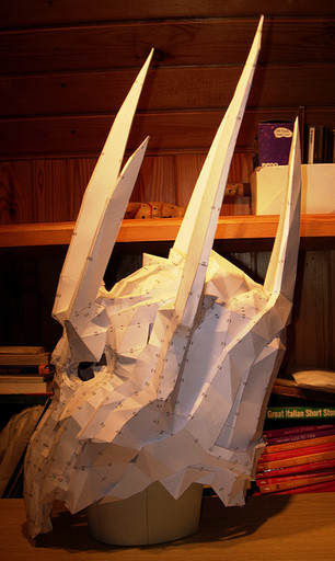 So have you figured out the jointing process? I saw a video on youtube last year about how to form a mandible jaw so that it is pressured to your chin and allows it to move with your mouth, just a thought if I can find it again (which I need to now) I'll message it to you on here. Anyways. What all have you figured out? I am going to use this to make a costume for my son because he needs a frost dragon costume. Would using a very heavy weight (32lb probly) cardstock be a good option or is that what you used? Would spraying it with elmer's aerosol spray give it enough strength to be useable for 2-3 wears? Have you made more of these it's really lovely. Maybe a fox? wink wink wink! Anyway.. How the HELL do I open a PDO?!?!
