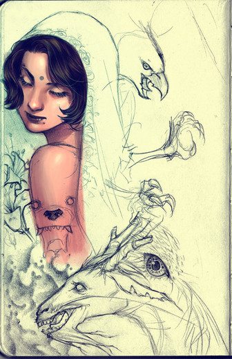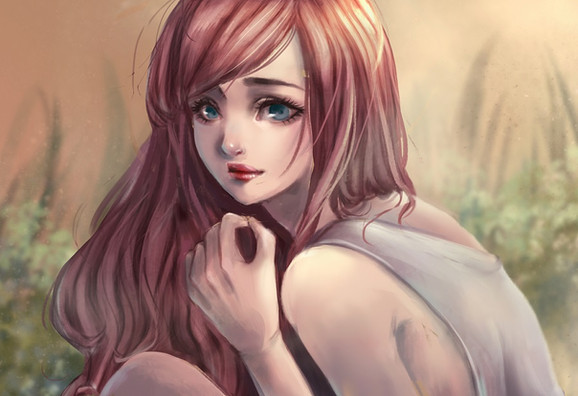 First, this piece is very lovely! It's an overall balance of simple yet contains captivating details (such as the eyes and lips), which are elements of good design, and I always say, all good artists are designers as well. The color harmony is executed very well here, go go complimentary colors! Also, I feel that your super smooth painting works very with your style. It's realistic elements cooperate well with the non realistic and makes this perfect balance of unique and quality art.