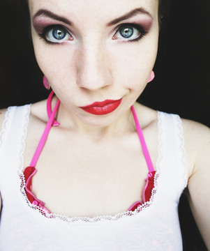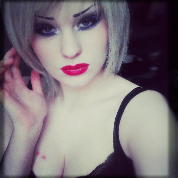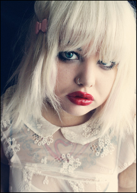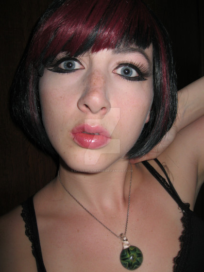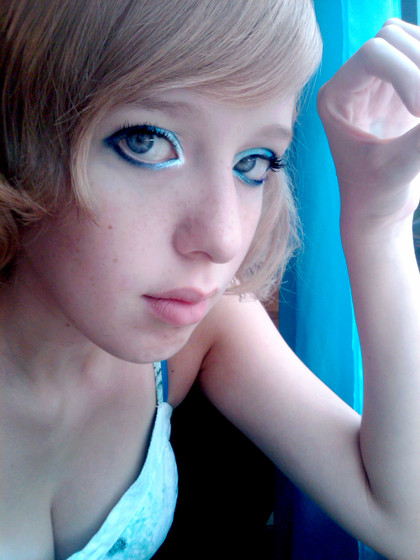This waxwork doll look - it's a garish lampoon of glamor, you know? But as I said in another comment, there's real beauty beneath that can't quite be sublimated. And as other commenters have noted, the way you brought the suggestion of your very womanly boobs into the frame juxtaposes against your natural innocence... so it's like a study in contrasts, of divergent forces pulling against each other...