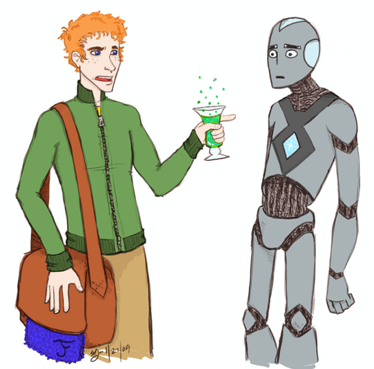 “Just dandy.” Rover wiggled his nose, making sure it was still firmly attatched. It was. Satisfied that he hadn’t given himself another bloody nose he touched the plate on the wall and the door swished open for him. This was it! By himself, all day, meeting new people, learning new things, there was a world of adventure out there to be roped and ridden. So why, as he stared out the door at the bright sunny morning, did he suddenly feel like someone had dropped a rock in his stomach? A rock that had suddenly burst into a swarm of fluttering ooflits that churned his insides? He swallowed hard. Maybe he really had eaten too fast.
