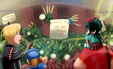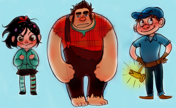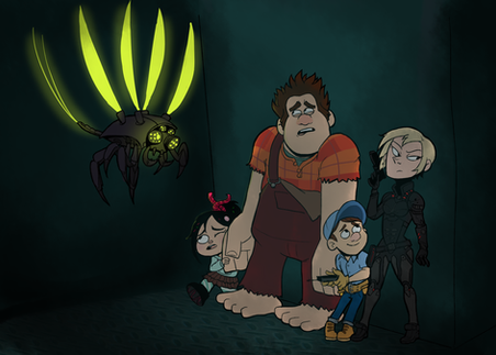 You did quite well on this drawing visually. I should probably mention that I really appreciate how good you are getting little details like Ralph's shirt pattern to look right in your artworks - the pattern looks like it would be a bit confusing to depict properly, with the different shades of orange needing to be arranged just so, and the green lines needing to run along just the right places. Not to mention the work it must've taken to make Calhoun's body armor... I like the way Felix looks here especially, and the swirl you put into Vanellope's ponytail was a nice touch.
