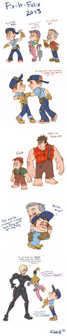 I like that you can visualize the parents in their respective shops in the Niceland over-world map, giving Felix and Katie upgrades for tools. I love the concept because it works for a game, which is integral to keep it in the same universe of the film. That's why I'd love to see the story because it blends so well, I'd almost be disappointed if this wasn't "Wreck-it-Ralph 2."