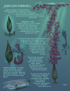 The Jssfloon language is a rich, complex one. Whistles, clicks and pulses make up the spoken sounds. However, words are often accompanied or punctuated with gestures of the lower hands. Hand position is also deeply important in greetings. Six major greetings identify the speaker's relationship with the other person. The closer they are the more physically close the greeting becomes. Every one of the greetings do have a 'shorthand' version for when the individuals are in a hurry or are too far away for an actual touch.Related content