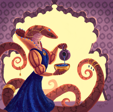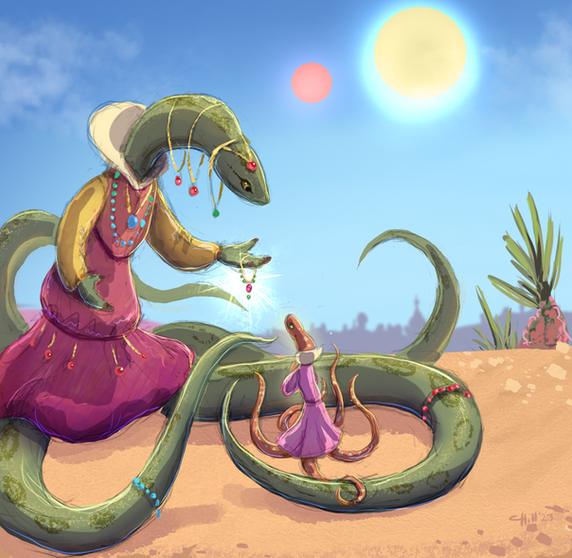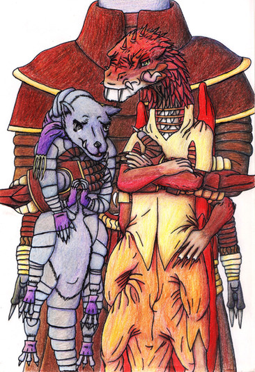 Now with your lovely princess and her people, I'm starting to want to do my own snake-like good guy race, though the story that follows with the one I'm toying with centers on a child of ambassadors whose parents are deceased but is being raised by an older sibling who followed in their parents' footsteps. Other characters would include a love interest for the elder sibling and several friends of both of them (all ambassadors as well), some kids who are friends with the young sibling and part of the party for various reasons, characters that pop in and out of the story as needed and various one-shot characters (who might move into the pop-in-and-out category).