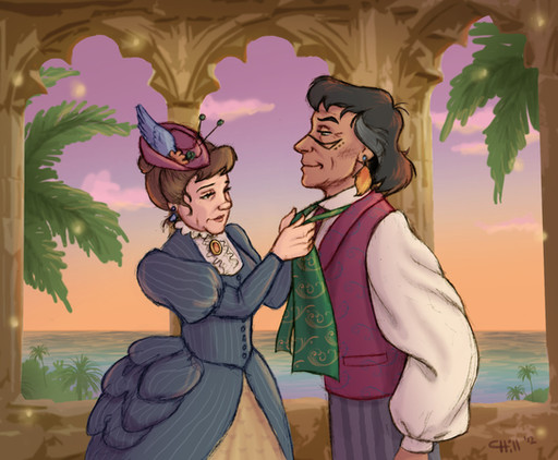 The scepter is pretty. I like the flecks of gold. The background is interesting too--odd shapes, those. (Just noticing some detail in this fantastically lovely drawing. Such invigorating characters! I love the hood the princess is wearing. I also like how Rover blushes up to his ears.
