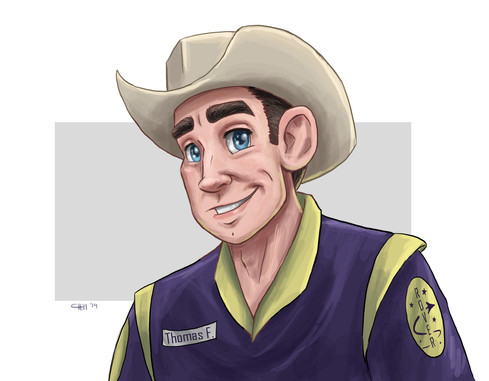 Soooo. It appears that there has been an art trend going around a hashtag #drawthisinyourstyle . Where someone uploads a thing and others are welcome to copy it and give it their own spin in the style they like to work in. This is my contribution. Rover.....of course.Rover Finnigan, for those who don't know, is a star trader. A man with a slick tongue, a knack for selling anything to anyone (no matter their species, gender or number of heads), and an obsession with cowboys and the old west, and aaaand a tenancy to chase after trouble like it was the gold at the end of the rainbow. He is also a cyborg with an arm that has everything in it but the kitchen sink. Ask him about how he got it........you never know what story you will get.