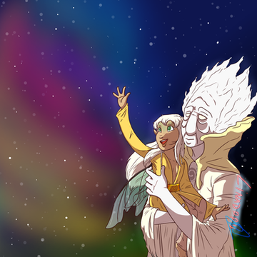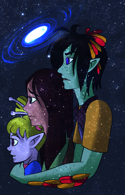 It was night inside the healing house of Filniss and all was quiet save the hushed voices of nurses and the soft bubbling of healing tanks. In the circle green room on the second floor two figures slept. Holographic medical monitors encircled a bed in the center of the room, their screens rimming everything in a soft blue light. Outside the picture window colorful auroras danced through the black sky, playing with the flickering stars.