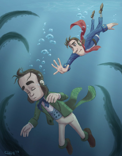 Captain: How's THAT for a timely rescue, eh Chuck?Darwin: C-Captain... WATCH OUT FOR THAT--