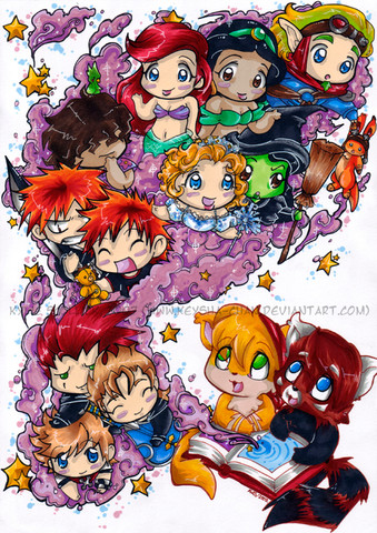 This artwork reminds a lot of people of Kingdom Hearts, I believe. Besides the fact that i think Jasmine's chibi style is cute...I really like Ariel's hair.