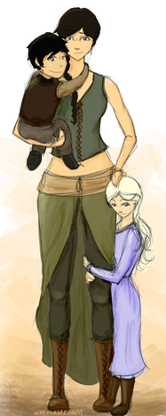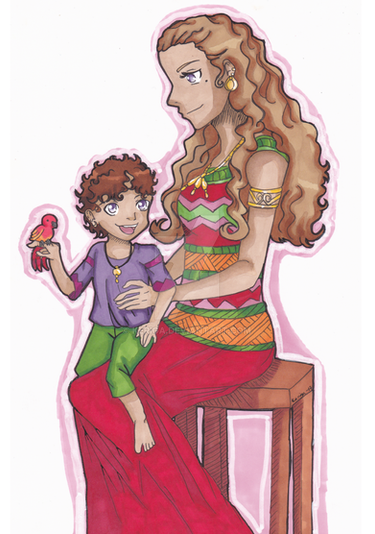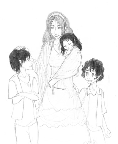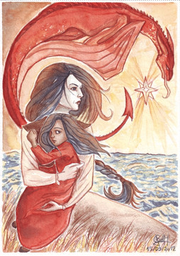 The first time my character Ti-Enna ever meets a dragon.Ti-Enna, of course, is the name of the baby. Ni-Tanya, her older sister, is holding her mother's hand.