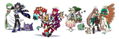So these were meant to be a shading/pose test, but then I fell in love and wanted to post this. These are my main characters from my three current favorite fan made Pokemon games, Insurgence, Rejuvenation, and Reborn. I tried to base the poses on actual Pokemon trainer characters, lass, beauty and ace trainer I believe.The first girl is Yuna, she uses a custom sprite made by Jun I believe. I changed up the hair and bow color though, because I like green a bit more than red. Yuna's starter is Cinder the gentle yet mischievous Delta Charmander! I imagine Yuna and Cinder like traveling and having fun together, despite all the bad happening around them. Yuna can't remember a lot, so not a lot bothers her!