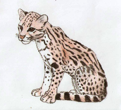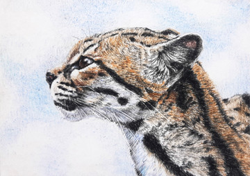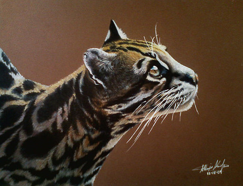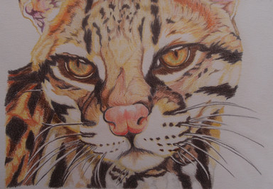 This wild cat is found in Central and South America. It was once hunted for its beautiful coat, but is now internationally protected. It remains a great attraction in zoos. It is a solitary night hunter and eats small mammals from deer, to rabbits, and rodents. It also eats reptiles, crabs, and fish. The ocelot can also climb trees to catch birds.This was drawn on double-weight mayfair paper with prismacolour pencil crayons