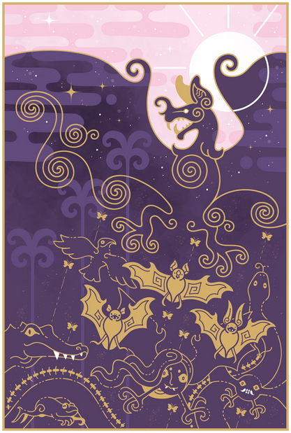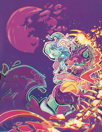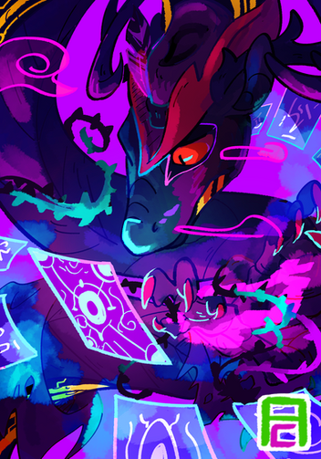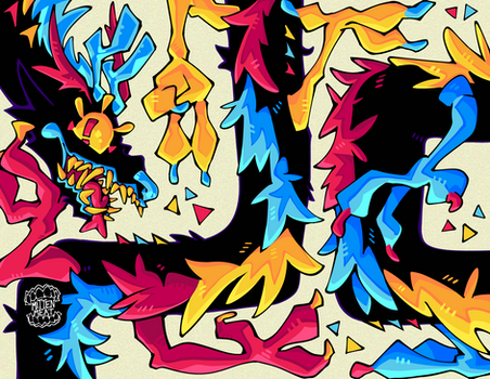 Another beast. Companion piece to COLOR BLEED: www.deviantart.com/chocodiley/…..."Companion" meaning derived from the same set of exploratory concept sketches. I liked the sleeping background foxes more for symbolism reasons, but I still wanted to finish this one up because "psychedelic alligator" is not a concept I've played with much before (unlike foxes, which are apparently hot pink with crazy eyes and spiraling markings by default in my world...).