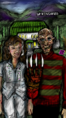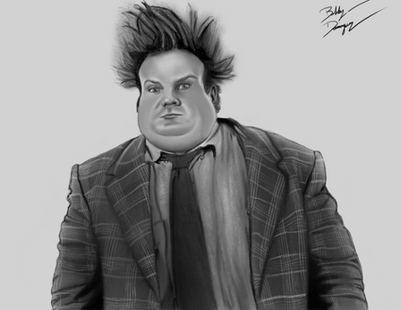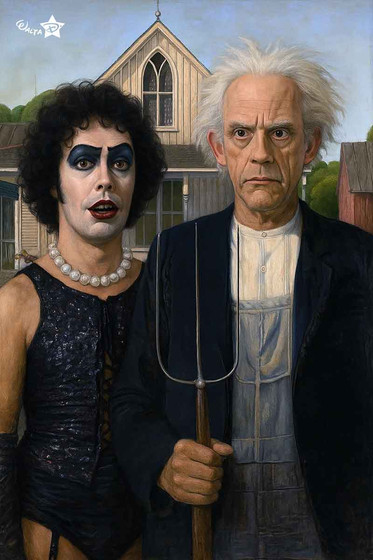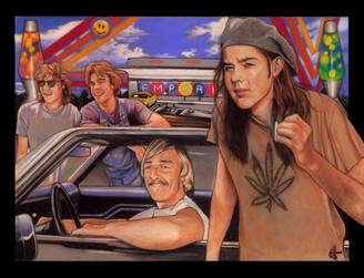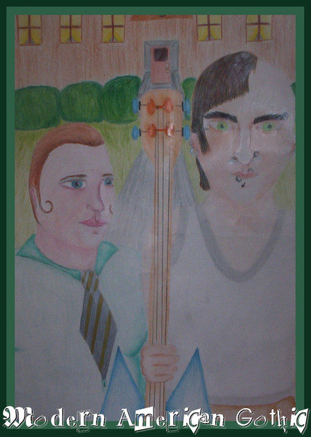 Based from the old American gothic painting and the D, This is Tenacious D... Jack Black and Kyle Gass, and Dave Grohl as the Beelzeboss.. Pastels on velour...8" x 10".Related content